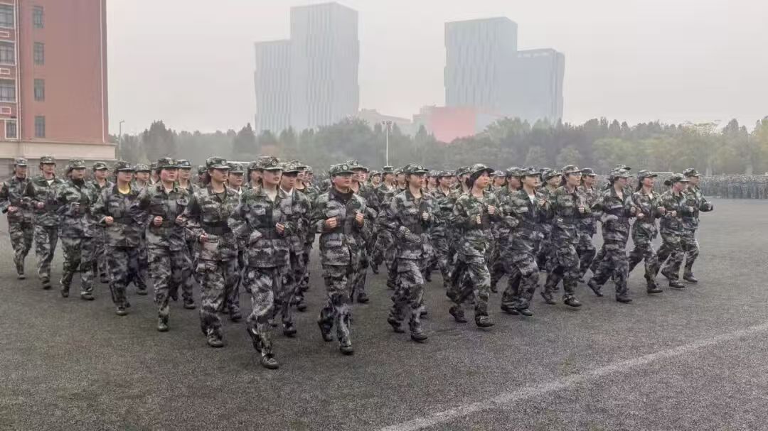 分列式率先开启。旗手方阵擎鲜艳团旗引领,团旗风中猎猎,如精神旗帜彰显青春信仰与担当。随后各方阵整齐通过主席台:齐步时摆臂划一、步幅精准,传递军人严谨与坚毅;跑步时步伐矫健、呼号震天,融青春活力与军人飒爽;队列展示中,转体、立正等动作行云流水,尽显军训磨砺后的纪律性与集体凝聚力。